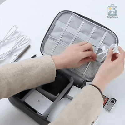 ✅ Step 2 – Arrange Your Gear: Use loops and pockets to store cables, chargers, and gadgets.